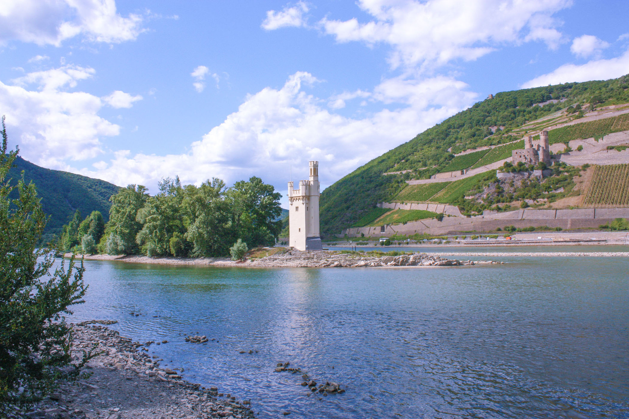 The famous landmark mice tower is located on a small island on river Rhine in front of the city.